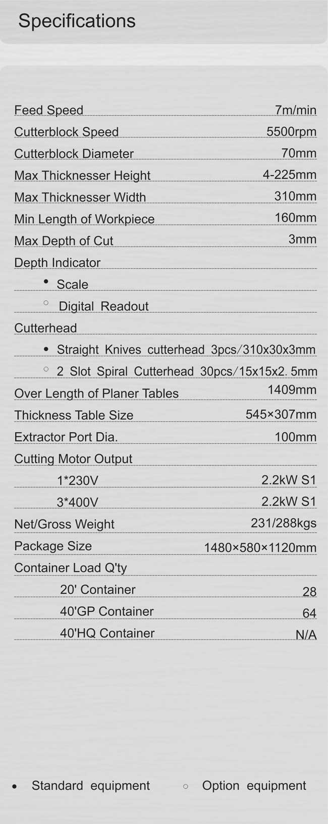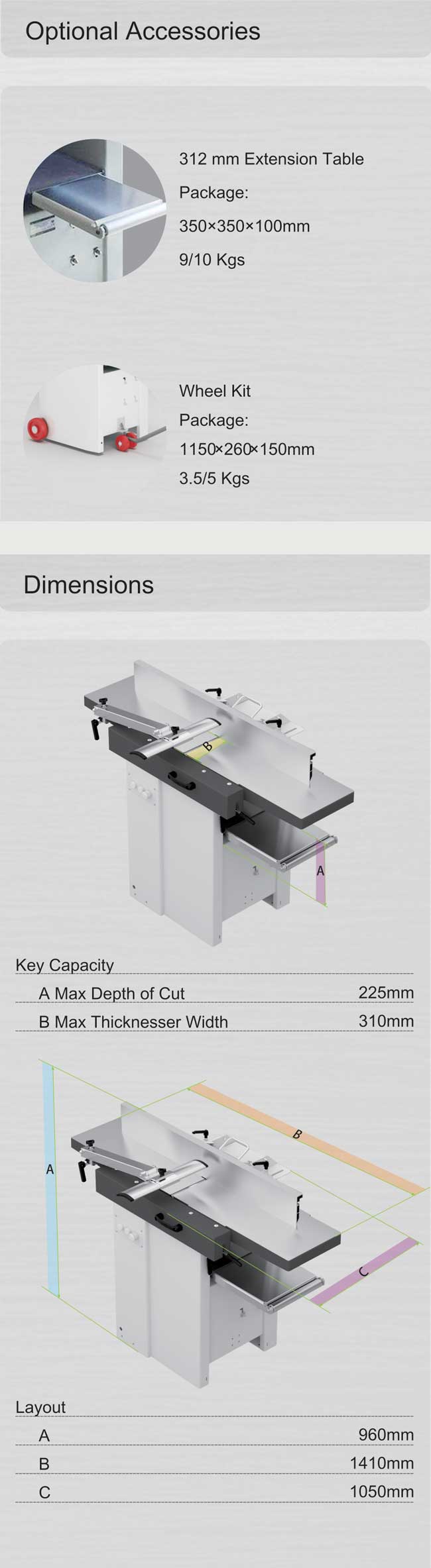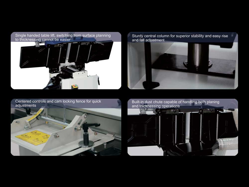 The PT310B has a large 310 x 255mm capacity. With the convenience of single handed table lift (no need to remove the fence), switching from surface planning to thicknessing cannot be easier. This versatile machine features an extra large aluminum extruded fence with centered controls and cam locking for quick adjustments.