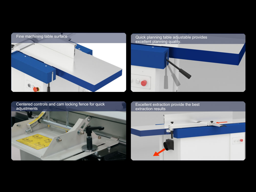 The PL410B features a total length of over 2 Meters. The heavy cast-iron tables are supported by parallelogram adjusters and easy controlled Levers. The fence is a heavy profile with centered controls and cam locking for quick and repeatable accuracy. The front control panel allows for quick, easy operation.